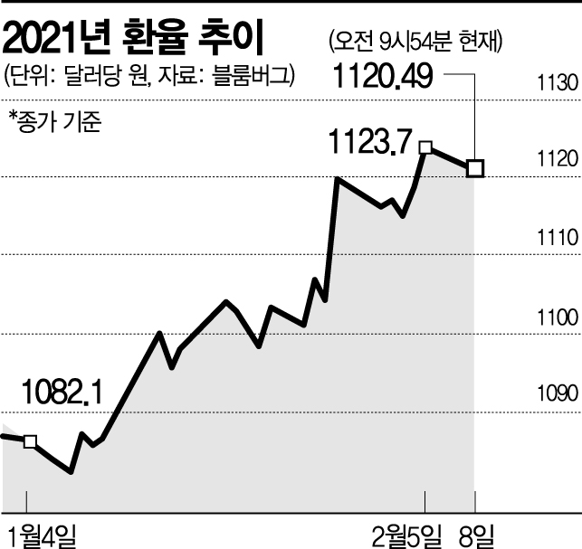 미 달러화가 강세를 보이면서 상대적으로 원화가치도 하락, 원·달러 환율은 올 들어 꾸준히 오르는 모습이다. 이날 서울외환시장에서 원·달러 환율은 1118.0원에 개장한 뒤 오전 9시54분 현재 1120.49원에 거래되고 있다. 지난 5일 원·달러 환율은 1123.7원까지 올라 지난해 11월5일(1128.2원) 이후 최고치를 찍기도 했다. 연초 대비 환율은 38원이상 뛰었다.