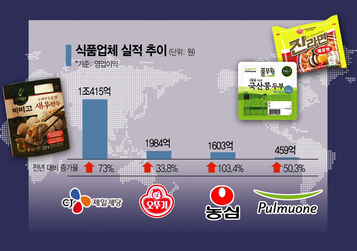 [아시아경제 이승진 기자] 코로나19 특수를 맞은 식품업계의 역대급 실적이 이어졌다. ‘집밥족’ 증가로 국내에서는 가정간편식(HMR) 판매가 급증하며 매출이 크게 증가했다. 해외에서는 만두와 라면 등 ‘K푸드’가 톡톡한 효자 역할을 했다. 식품업계는 핵심 제품에 역량을 집중하고, 해외시장 공략을 확대해 올해도 실적 고공행진을 이어간다는 계획이다.
