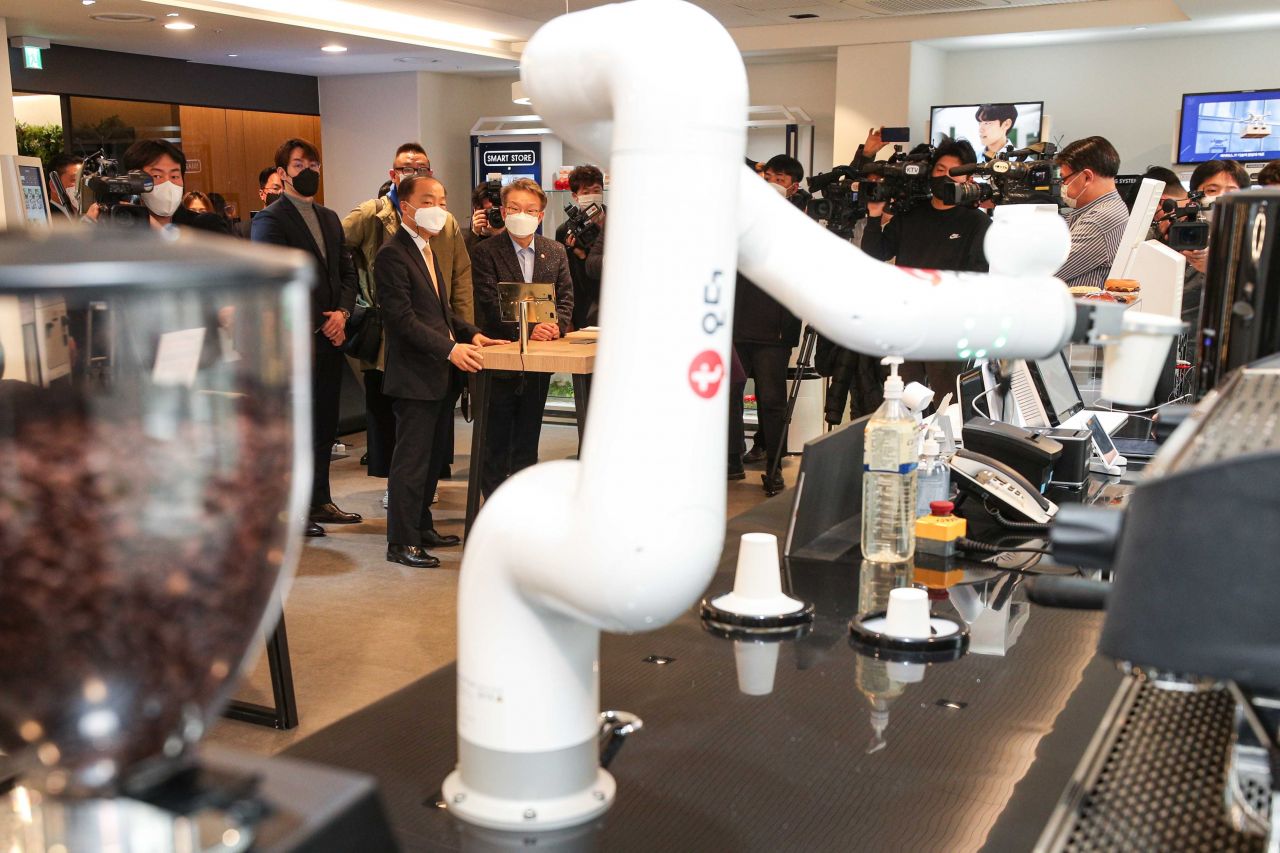 권칠승 중소벤처기업부 장관이 5일 서울 마포구 드림스퀘어를 방문해 로봇바리스타에게 커피 주문을 하고 있다./강진형 기자aymsdream@