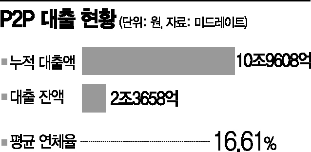 P2P 통계업체 미드레이트에 따르면 이날 기준 누적 대출액은 10조9608억원, 대출 잔액은 2조3658억원에 달한다. 연체율은 평균 16.61%에 이른다. 2017년 말(5.5%)에 비해 2년 6개월여 만에 연체율이 세 배 이상 높아졌다.금융당국, P2P 전수 조사금융당국은 다음 달 26일까지 모든 P2P사에 감사보고서를 제출하라고 요구하는 한편 투자자들에게 주의를 당부했다. 최근 경찰 수사를 받거나 구속된 ‘넥펀’, ‘팝펀딩’ 등 가짜로 대출채권을 만들어 투자금을 횡령하거나 ‘돌려막기’를 하는 사례가 더 있는지 확인하기 위한 것이다.