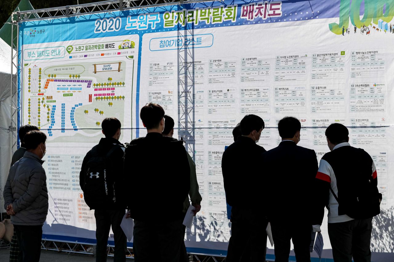 4일 서울 노원구 등나무근린공원에서 열린 '2020 노원구 일자리박람회'를 찾은 구직자들이 채용공고를 보고 있다./강진형 기자aymsdream@