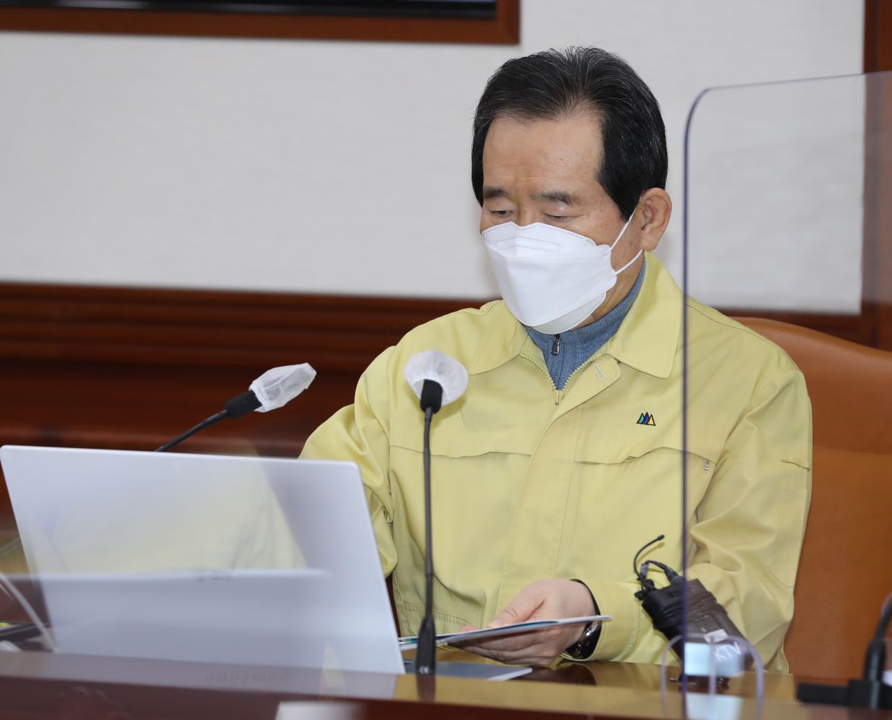 정세균 국무총리가 14일 오후 정부서울청사에서 열린 신종 코로나바이러스 감염증(코로나19) 대응 중앙재난안전대책본부(중대본) 회의에 참석, 자료를 보고 있다. 2021.2.14 [이미지출처=연합뉴스]