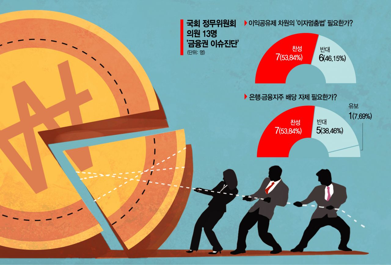 아시아경제가 15일 국회 정무위 소속 국회의원 24명을 대상으로 '금융권 주요 이슈' 설문조사를 실시한 결과, 입장을 밝힌 13명의 의원 중 7명(53.84%)은 이익공유제 차원의 '금융기관 이자멈춤법' 추진에 찬성한다고 응답했다.