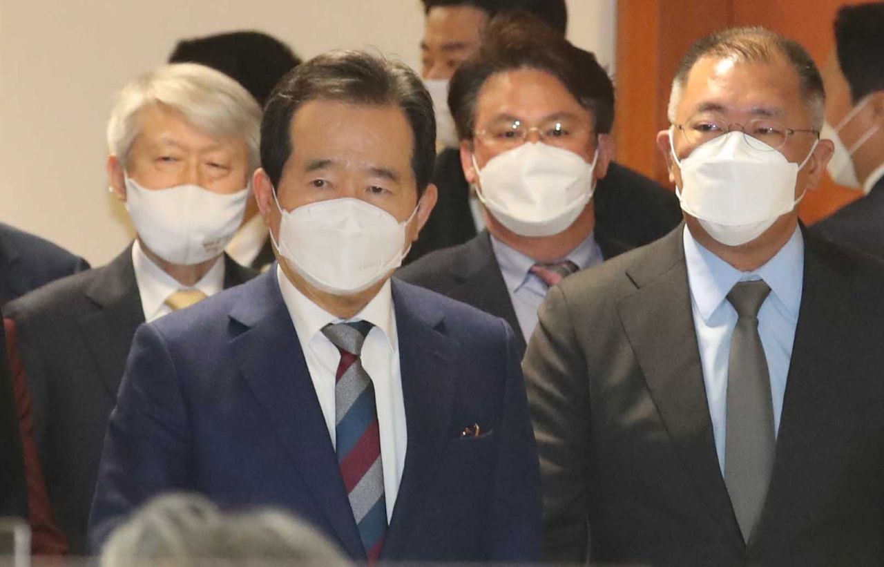 정세균 국무총리와 정의선 현대자동차그룹 회장이 18일 경기 화성시 현대자동차 남양기술연구소에서 열린 국정현안점검조정회의에 참석하고 있다./화성=강진형 기자aymsdream@