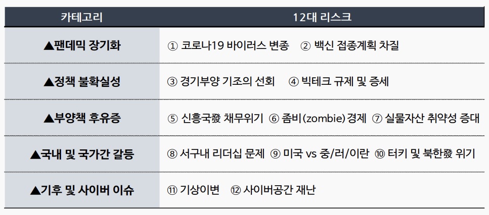 이외의 미래 성장을 위협하는 각종 기후변화 이벤트, 사이버 공격, 기술적 장애 등에 노출이 빈번해질 수 있다는 점도 주요 리스크 중 하나로 거론됐다.
