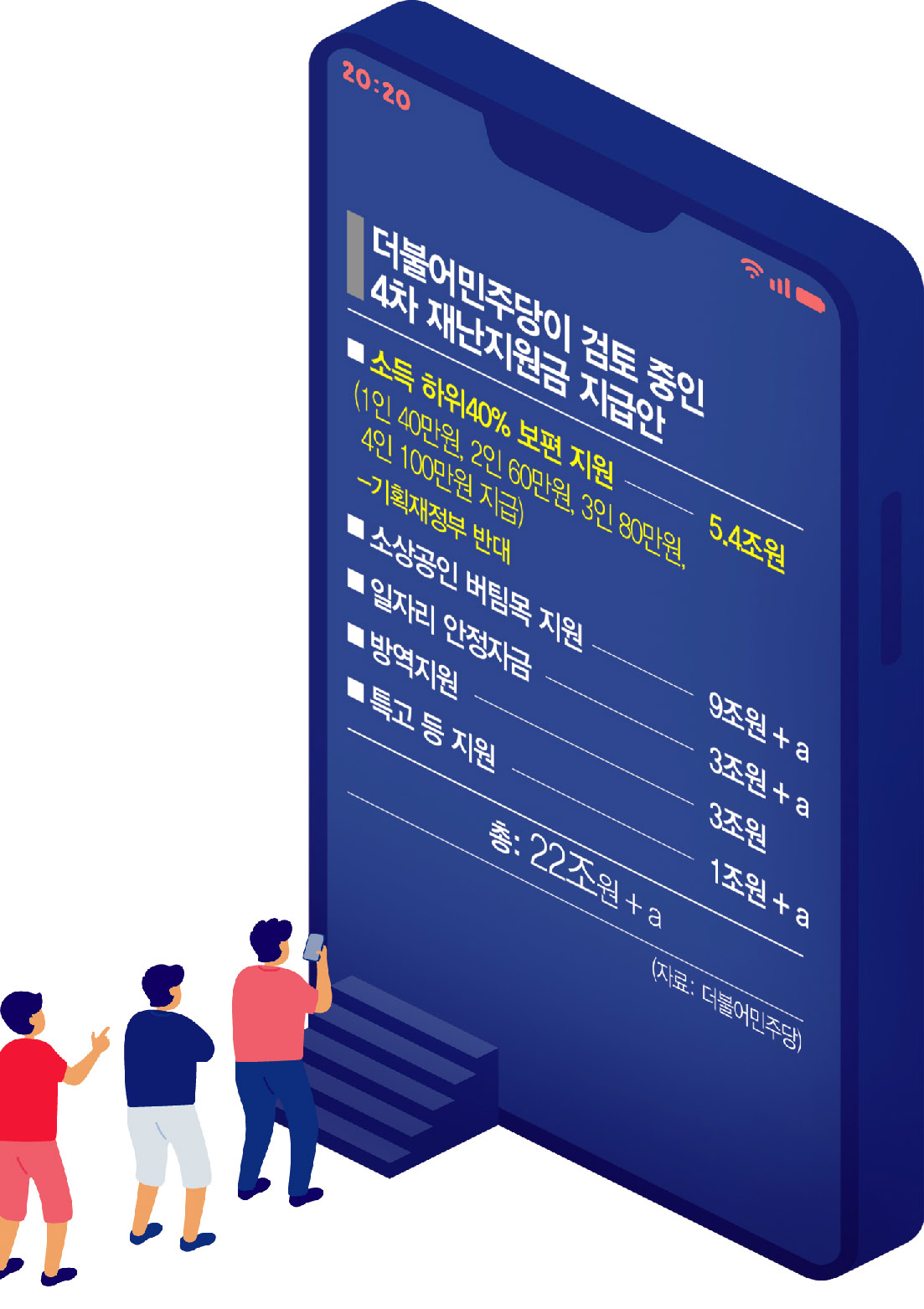 22일 더불어민주당에 따르면 당이 제시한 저소득층 가구의 기준인 ‘소득하위 40%’에 해당하는 가구는 총 820만가구로 집계됐다. 이들을 대상으로 ‘1인 가구 40만원, 2인 가구 60만원, 3인 가구 80만원, 4인 가구 100만원’을 지급할 경우 소요되는 재정은 약 5조4000억원으로 추산됐다.