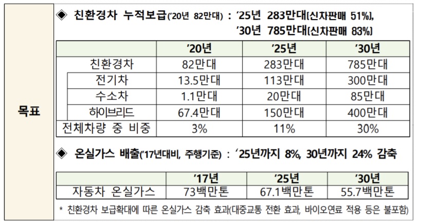 정부는 2030년까지 온실가스 24% 감축을 목표로 2025년 283만대, 2030년 785만대의 친환경차를 누적 보급한다. 전체 차량의 각각 11%, 30% 비중이다. 신차판매에서 차지하는 비중은 각각 51%, 83%까지 끌어올린다는 방침이다.