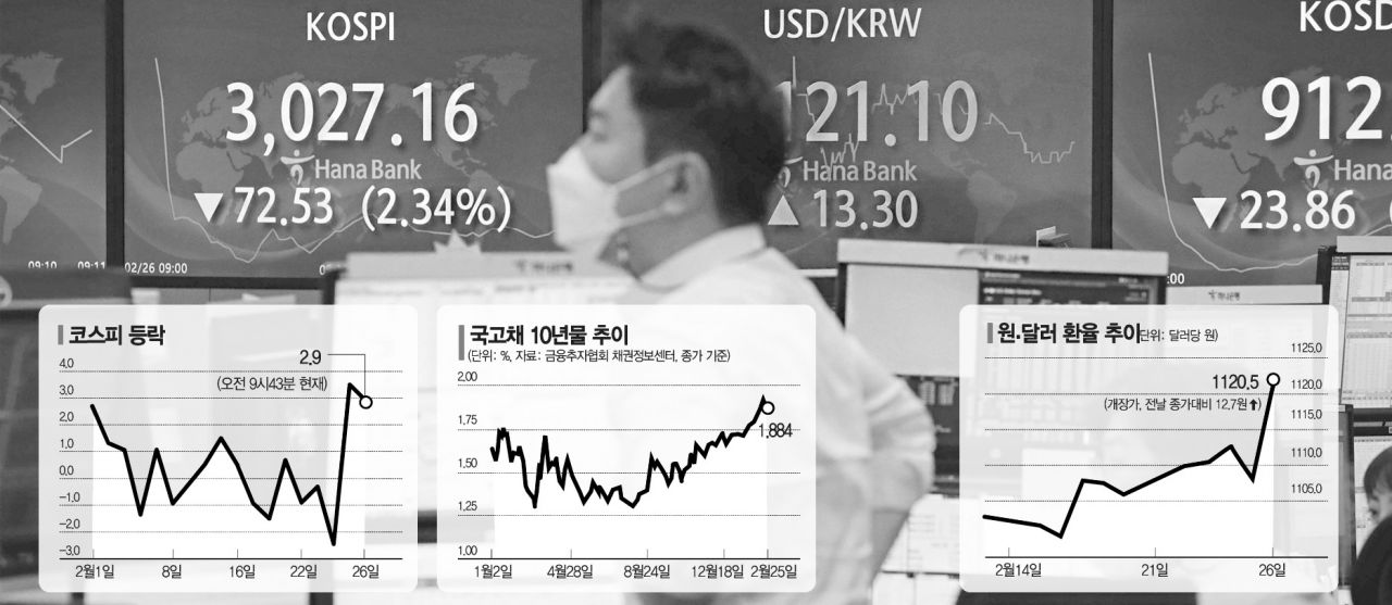 26일 서울외환시장에서 원·달러 환율은 전일 종가보다 12.7원 급등한 달러당 1120.5원에 개장했다. 이후 1120원대 흐름을 유지하고 있다. 간밤 미국시장에서 국채금리가 급등한 여파로 달러화 강세가 나타나고, 투자자들 사이에선 위험자산 선호 현상이 급격히 위축되면서 원·달러 환율을 밀어올리고 있다. 전날 종가 대비 환율 개장 폭(갭 업)은 지난해 3월23일(18.5원) 이후 가장 컸다. 작년 3월23일은 코스피 지수 1500선이 깨지며 시장이 크게 흔들렸던 날이다. 환율 레벨 자체는 이달 초에 1123.81원을 기록한 적도 있어 높지 않지만, 한국과 미국의 시차를 감안했을 때 미국의 시장금리와 달러인덱스 움직임이 국내시장에 미친 영향이 그만큼 이번에 컸다는 뜻이다.
