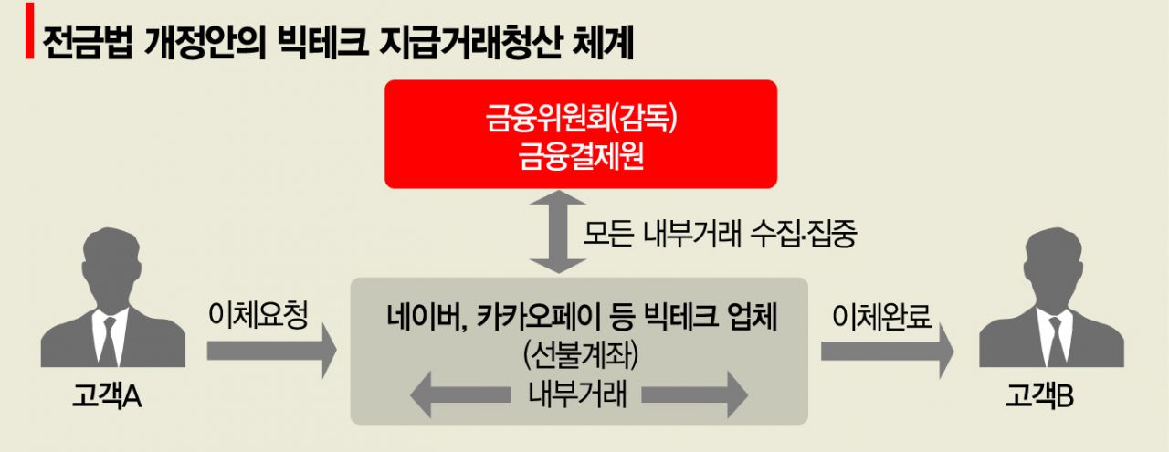 문제는 전금법 개정안이 핀테크·빅테크 기업의 ‘내부 거래’도 외부기관(금결원)의 청산을 통해서 하고, 이를 금융위가 허가·감독하도록 했다는 겁니다. 지금까지 카카오페이로 카카오페이 계좌에 돈을 송금하는 내부 거래는 청산 과정을 거치지 않았습니다. 개정안이 통과되면 핀테크·빅테크 기업도 금결원이 청산 과정을 거치고 금융위가 관리·감독하게 되는 거죠.