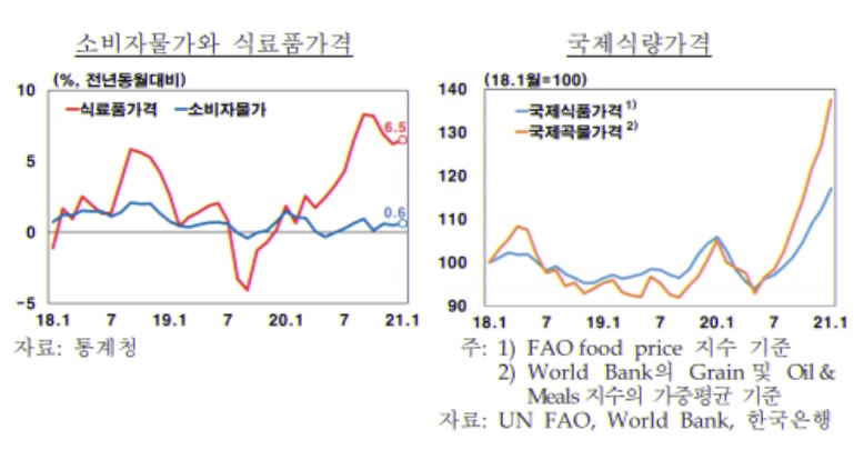 한은 관계자는 "최근 국제곡물가격 상승이 오름세가 확대되거나 장기화할 경우 가공식품가격 상승으로 이어질 가능성을 배제하기 어렵다"며 "국내 수요회복 속도와 관련업계 비축물량 등에 따라서도 달라질 것"이라고 말했다.