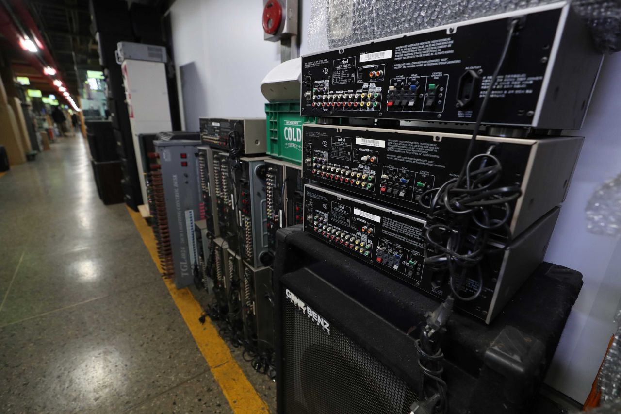 18일 코로나19 장기화로 노래방 폐업이 늘면서 업소에서 쓰던 각종 장비와 집기 등이 서울 시내 한 노래방 중고기기 매매업소에 쌓이고 있다. /문호남 기자 munonam@