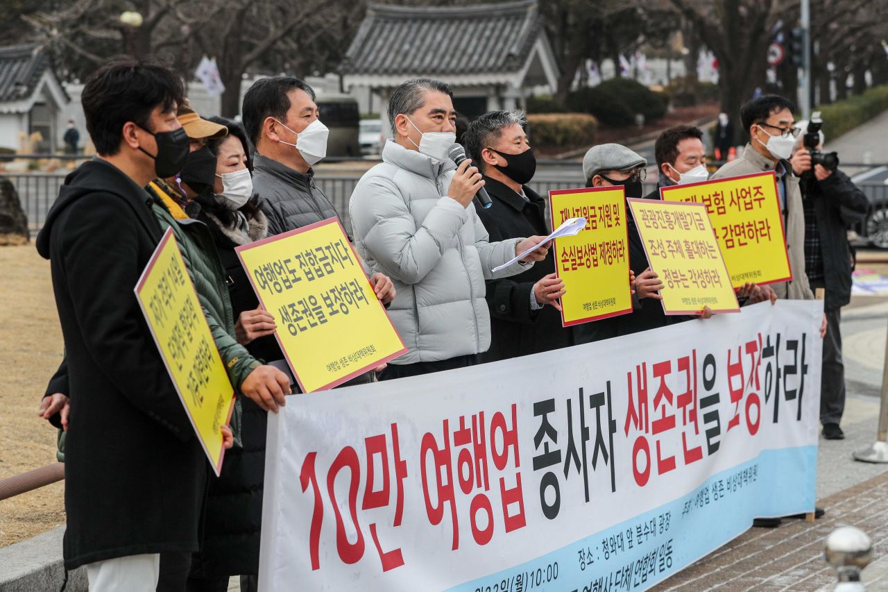 22일 서울 종로구 청와대 분수대 앞에서 여행업생존비상대책위원회 소속 소상공인들이 여행업 종사자 생존권 보장을 촉구하는 기자회견을 하고 있다./강진형 기자aymsdream@