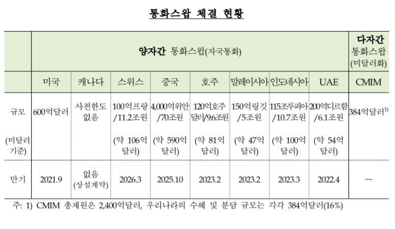 한은은 1일 현재 사전한도가 설정되지 않은 캐나다를 제외하고 총 1962억달러 상당의 통화스와프 계약을 체결하고 있다. 미국(600억달러), 중국(59억달러 상당) 등을 비롯해 캐나다(사전한도 없음), 호주(81억달러 상당), 말레이시아(47억달러 상당), 인도네시아(100억달러 상당), 아랍에미리트(54억달러 상당) 등 8개국과 계약을 체결하고 있다. 다자간 통화스와프(CMIM)는 아세안(ASEAN·동남아시아국가연합)+3 국가들(384억달러, 13개국)과 체결 중이다.