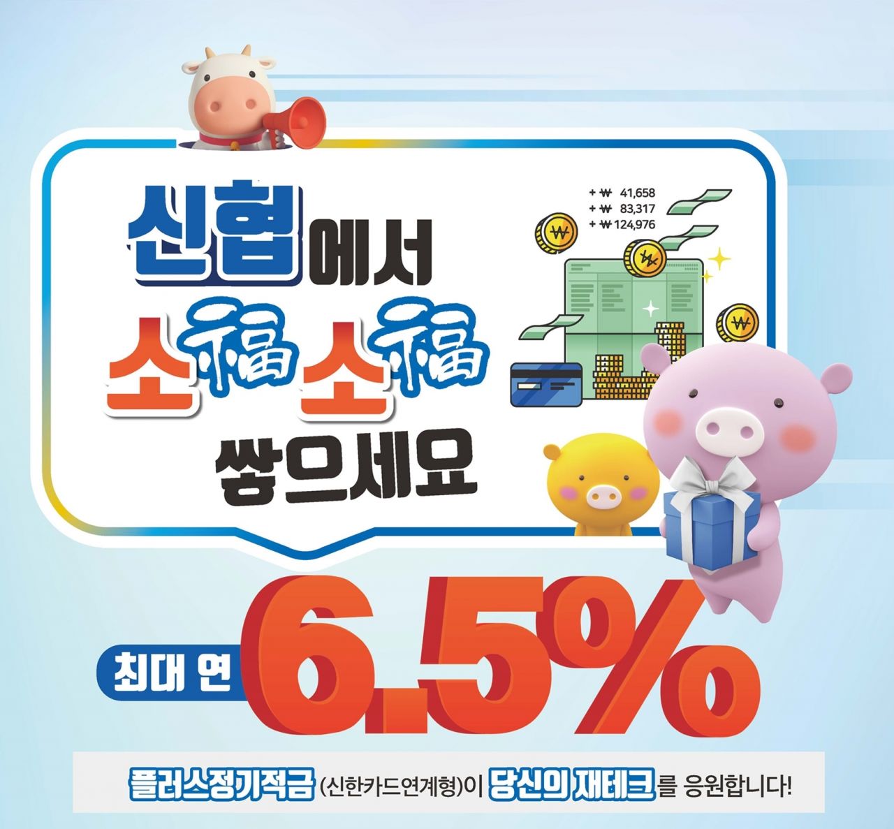 신협중앙회는 최고 6.5% 금리를 주는 ‘플러스정기적금’ 상품을 6개월간 한정 판매한다고 2일 밝혔다. 신한카드 생애 첫 고객이거나 최근 6개월 동안 이용실적이 없는 휴면 고객이 대상이다. 만기는 1년으로 1달 기준 1만~30만원까지 납입할 수 있다.