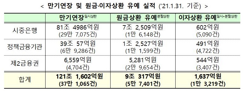 지난 1월 말 기준 전 금융권 만기 연장은 121조원(37만1000건), 원금 상환 유예 9조원(5만7000건), 이자 상환 유예 1637억원(1만3000건) 등이다.