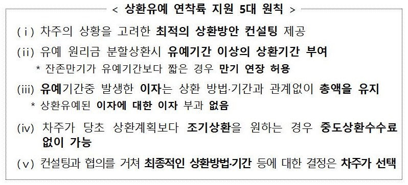 5대 원칙은 ▲차주의 상황을 고려한 최적의 상환방안 컨설팅 제공 ▲유예 원리금 분할상환시 유예기간 이상의 상환기간 부여 ▲유예기간중 발생한 이자는 상환 방법·기간과 관계없이 총액을 유지 ▲차주가 당초 상환계획보다 조기상환을 원하는 경우 중도상환수수료 없이 가능 ▲컨설팅과 협의를 거쳐 최종적인 상환방법·기간 등에 대한 결정은 차주가 선택 등이다.