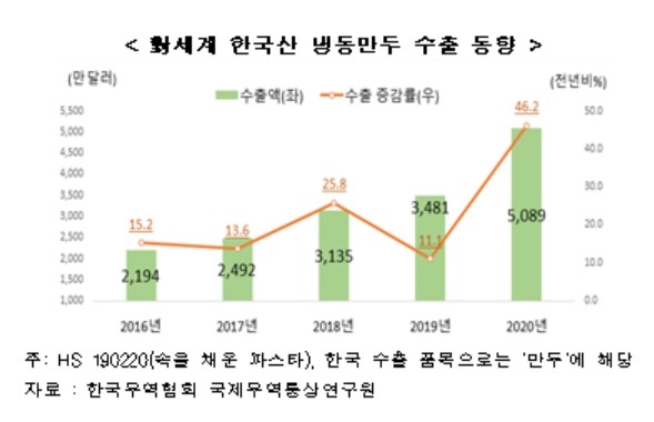한국무역협회 국제무역통상연구원이 3일 발표한 '유망품목 AI리포트-냉동만두' 자료에 따르면 지난해 냉동만두 수출 규모는 5089만달러로 전년대비 46.2% 증가한 것으로 집계됐다. 냉동만두 수출은 2016년부터 지난해까지 연 평균 23.4%씩 증가했다.