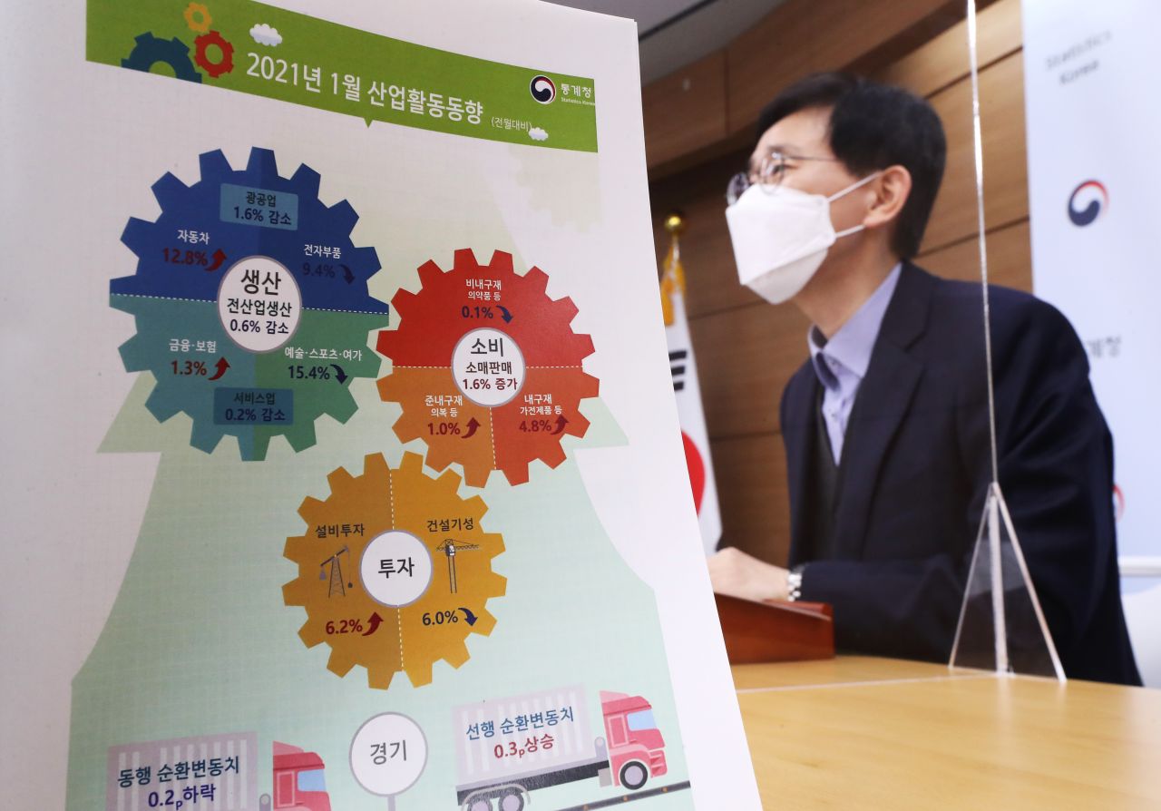 어운선 통계청 경제동향통계심의관은 "코로나19가 재확산한 영향으로 서비스업의 생산이 줄었고, 광공업은 전월 대비 2.7% 증가한 지난해 12월의 역기저효과가 작용하면서 감소로 전환했다"며 "전체적으론 전월의 높았던 수치에서의 상대적 조정에 따라 위축됐다"고 설명했다.
