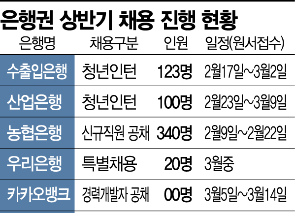 금융공기업에서도 상반기 공채 공고가 속속 이어지고 있다. 예금보험공사가 이달 중 신입직원 상반기 채용공고를 내고 15명 안팎을 뽑을 예정이고 한국자산관리공사(캠코) 역시 청년인턴을 70명 내외로 뽑아 이후 인턴 중 90% 이상을 정규직으로 전환할 방침이다.시중은행도 공채 스타트