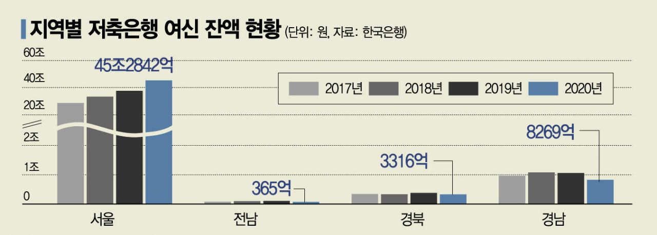 저축은행 전체 여신 83%가 수도권, 서울 비중도 58.4%6일 한국은행 및 저축은행업계에 따르면 지난해 저축은행 여신액은 77조4754억원에 달했다. 이중 수도권(서울ㆍ경기ㆍ인천)이 차지한 금액은 65조738억으로 전체의 83.9%였다. 서울로만 놓고 봐도 45조2842억원으로 58.4%였다.