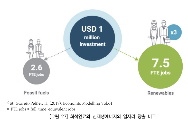 신재생에너지에 100만 달러를 지출하면 평균 7.49개의 정규직 일자리가 창출되는데, 이는 화석연료 일자리(2.65개)의 3배에 가깝다.