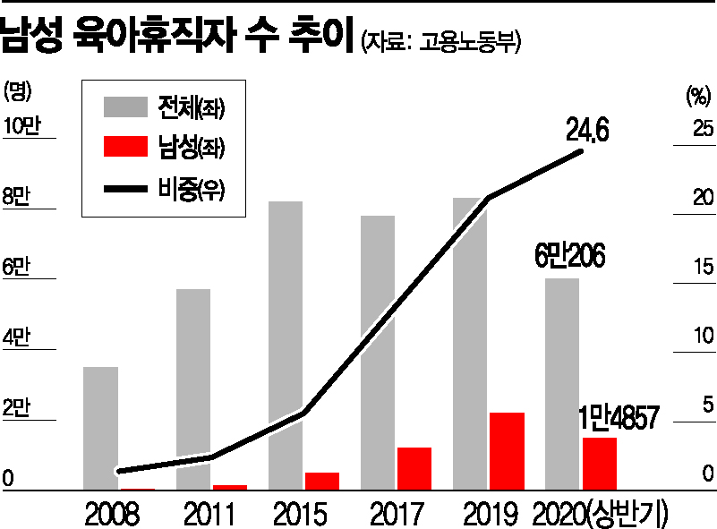 남성 육아휴직자는 10여년 전인 2009년만해도 연간 502명에 불과할 정도로 주변에서 찾아보기 드물었다. 출산율이 0.9명 수준인 최근보다 출산율이 높았지만(1.1명) 전체 육아휴직자 수 역시 3만5000명에 그칠 만큼 육아휴직 문화 자체가 제대로 자리 잡지 못했던 시기이기도 하다.