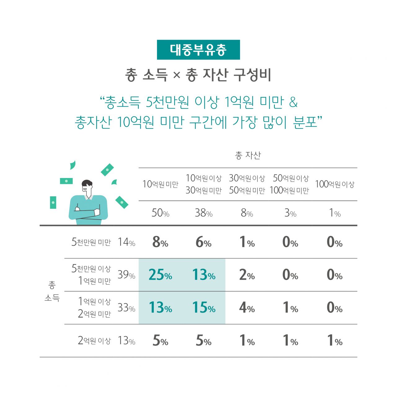 가구 연소득의 경우 부자들의 경우 2억원이상이 46%로 가장 많았고, 2억원이상 소득 구간에서 사업소득 34%, 근로소득 33% 재산소득 21% 순으로 구성되어 있었다. 반면 대중부유층의 경우 가구 총 소득은 5천만원이상 1억원 미만에 39%, 1억원이상 2억원 미만 구간에 33%가 분포되어 있었고, 전 소득 구간에서 근로소득 비중이 가장 높았다.