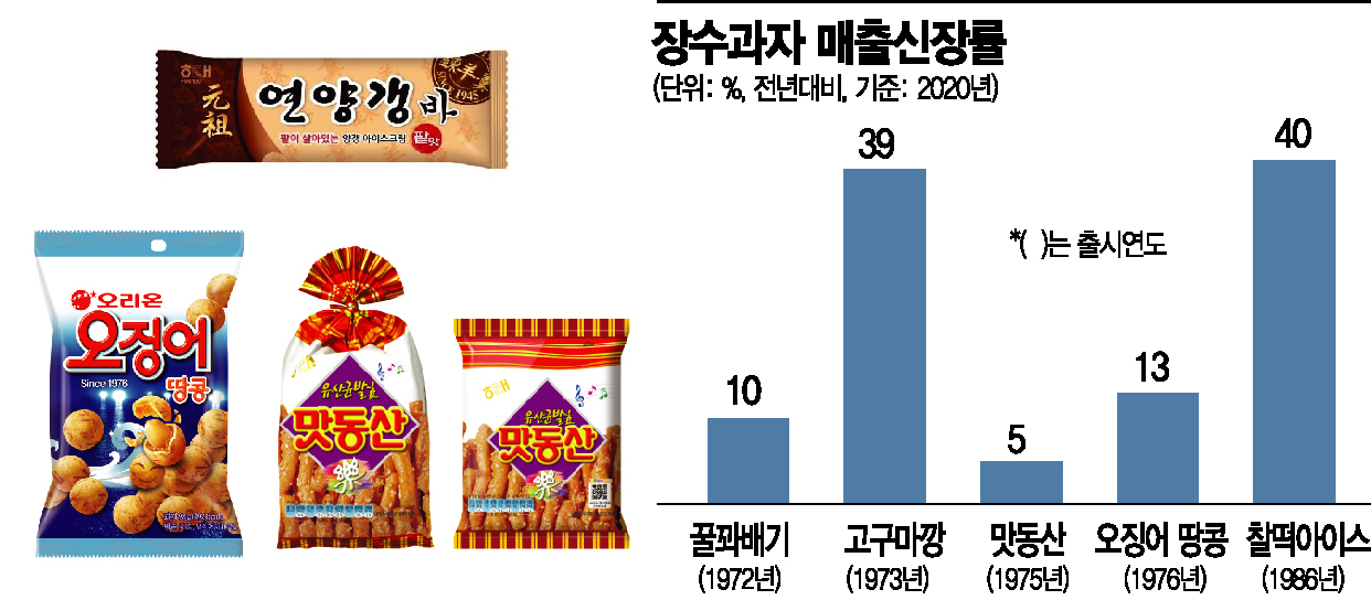 이 외에도 다양한 장수과자들이 지난해 큰 사랑을 받았다. 농심이 1973년 출시한 ‘고구마깡’의 작년 매출은 전년보다 39% 신장했다. 1972년 출시한 ‘감자깡’과 ‘꿀꽈배기’는 각각 20%와 10% 증가했다. 롯데제과의 ‘찰떡 아이스’의 경우 지난해 최장 기간의 장마에도 전년보다 40% 매출이 신장했는데, ‘옛날 맛’을 찾는 이가 크게 늘어난 영향이다.