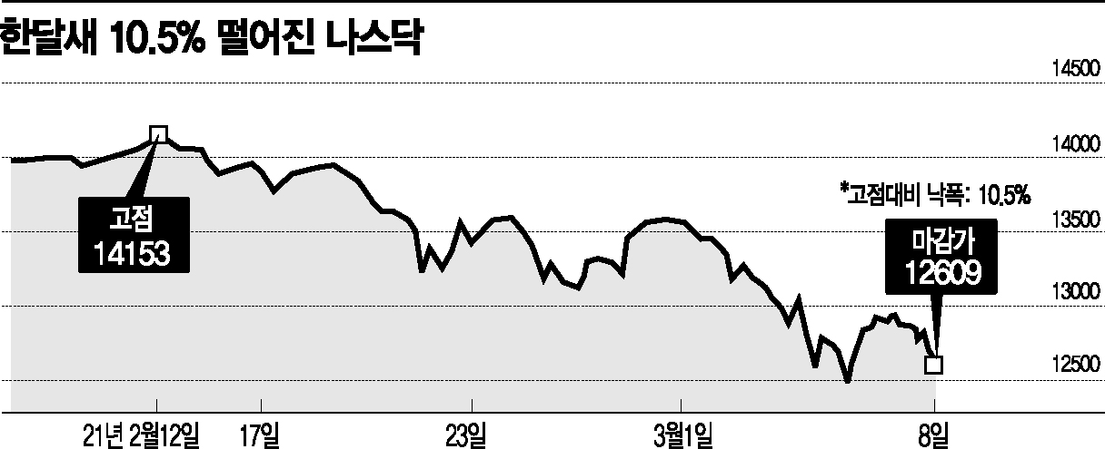 이날 국채금리 부담으로 나스닥은 전일보다 2.4% 하락 마감했다. 나스닥 지수는 지난달 12일 대비 10.5% 떨어졌다. 월스트리트저널은 이날 "나스닥이 조정 국면에 진입했다"고 진단했다.