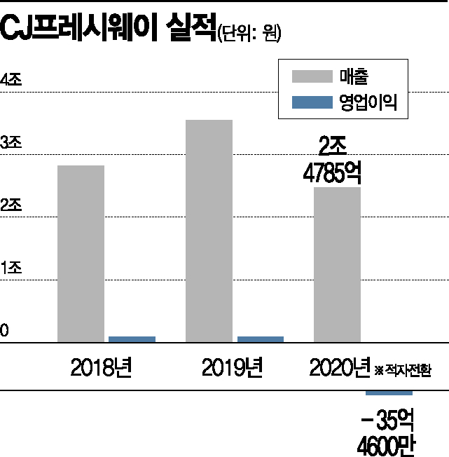한편 CJ프레시웨이는 지난해 코로나19 사태에 따른 단체 급식업의 침체로 35억4569만원의 영업손실을 냈다. 2019년도 580억원 흑자를 냈다가 적자 전환했다. 당기 순손실은 425억1769만원으로 전년도 95억8749만원 흑자에서 적자 전환했다. 매출은 18.87% 감소한 2조4785억원으로 집계됐다.