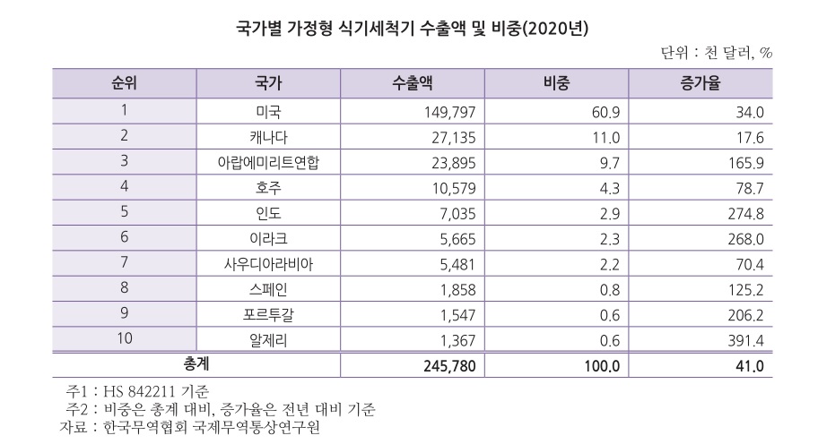 11일 한국무역협회 국제무역통상연구원에 따르면 지난해 우리나라의 가정형 식기세척기 수출액은 역대 최고인 2억4578만 달러로 집계됐다. 이는 전년과 비교해 41% 증가한 수치다. 지난해 4~5월에는 코로나19에 따른 주요국의 봉쇄조치로 식기세척기 수출이 각각 전년 동기대비 56.4% 감소한 783만 달러와 41.3% 감소한 1098만 달러를 기록하며 큰 타격을 입었다. 그러나 곧바로 반등에 성공하면서 6월 수출 2289만 달러로 시작해 연말까지 매달 2000만 달러 이상의 수출실적을 달성했다.