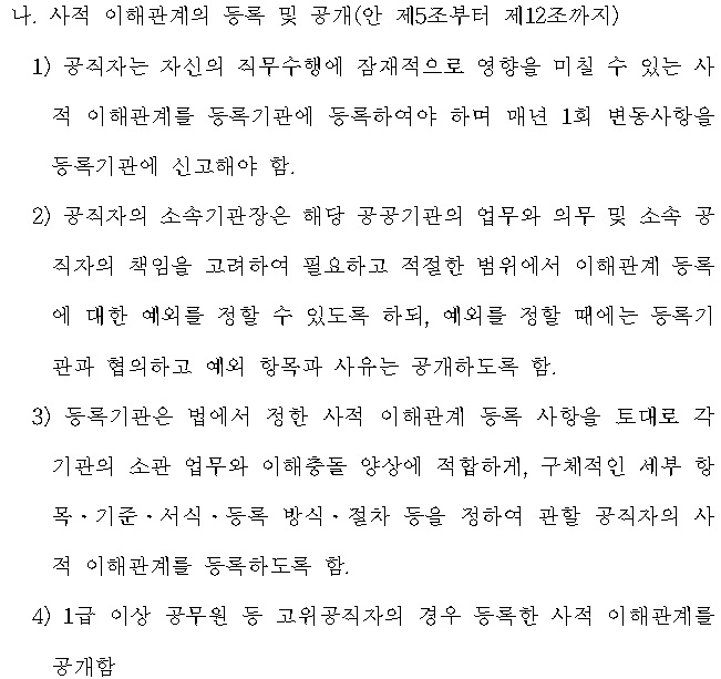 특히 개정 강도가 가장 높은 박용진 더불어민주당 의원의 발의안에 담긴 '사적이해관계자 사전등록제'가 관철될지에 관심이 쏠린다. 안에 따르면 ▲공직자는 사적이해관계자를 등록기관에 등록한 뒤 매년 1회 변동사항을 신고해야 하고 ▲공직자의 소속 기관장은 이해관계 등록의 예외를 정할 때 등록기관과 협의한 뒤 예외 항목과 사유를 공개해야 하며 ▲1급(차관보급) 이상 공무원 등 고위공직자의 경우 등록한 사적 이해관계를 공개해야 한다.