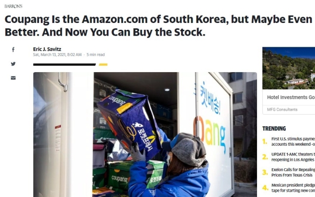 12일 미국의 투자 전문지 배런스는 쿠팡을 소개하며 투자를 권유하는 기사를 보도했다. /사진 = 배런스(Barron's) 캡처