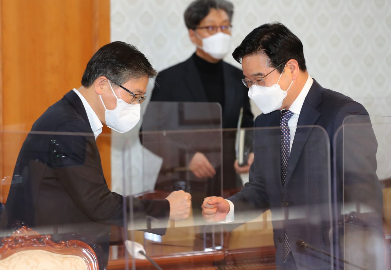 변창흠 국토교통부 장관(왼쪽)이 14일 정부서울청사에서 열린 LH 후속조치 관계장관회의에 입장하며 김창룡 경찰청장과 주먹인사를 하고 있다. 2021.3.14 [이미지출처=연합뉴스]
