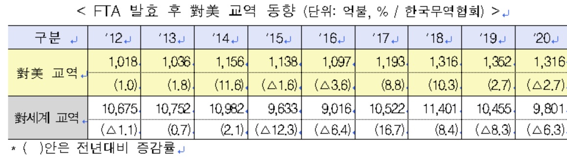 산업통상자원부가 14일 발표한 '한·미 FTA 발효 9년차(2020년) 교역 동향'에 따르면 지난해 양국간 교역은 전년 대비 2.7% 줄어든 1316억달러로 집계됐다. 코로나19 확산에 따른 세계 경기둔화, 글로벌 교역 감소와 저유가 영향으로 한국의 전체 교역액이 6.3% 줄어든 와중에도 대미 교역은 상대적으로 선방했다.