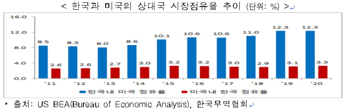 지난해 한국 수입시장에서 미국이 차지하는 비중은 12.3%로 전년과 동일했다. 중국은 같은 기간 2%포인트 늘어난 23.3%, 일본은 0.3%포인트 늘어난 9.8%를 기록했다. 미국 시장 내 한국의 점유율은 3.3%로 전년 대비 0.2%포인트 증가했다.