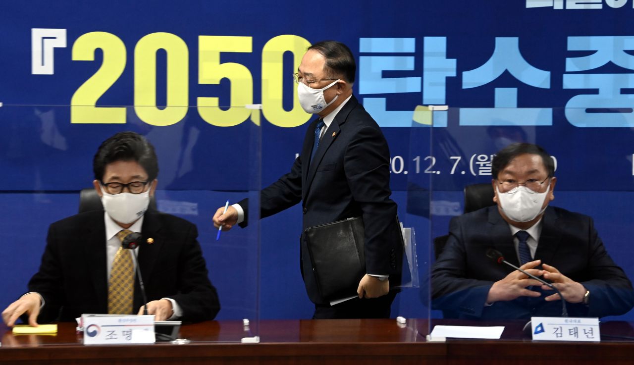 7일 국회에서 열린 ‘2050 탄소중립 실현 당정협의’에 참석한 홍남기 경제부총리 [사진=윤동주 기자]