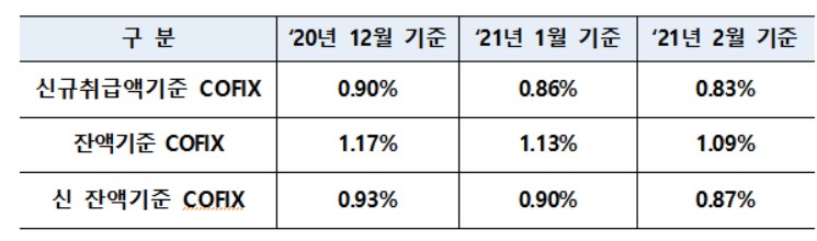 15일 은행연합회는 2월 신규취급액기준 코픽스가 0.83%로 전월대비 0.03%포인트 하락했다고 밝혔다. 지난해 12월 0.90%를 기록한 이후 두 달 연속 내림세다. 잔액기준 코픽스도 1.09%로 전월대비 0.04%포인트 내렸고 신 잔액기준 코픽스 역시 0.87%를 기록하며 전월대비 0.03%포인트 하락했다.