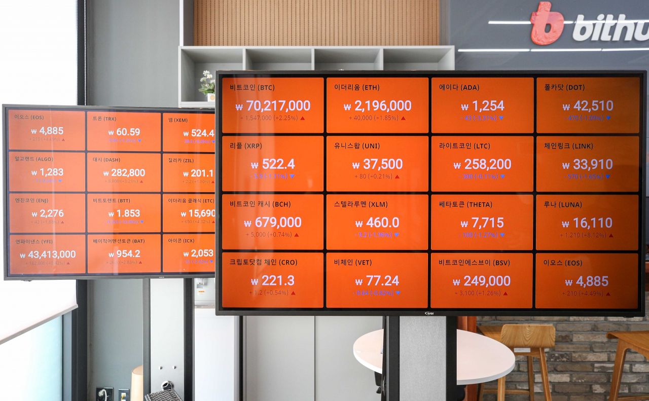 비트코인이 7천만원을 돌파하며 최고치를 경신한 14일 서울 강남구 빗썸 강남고객센터 시황판에 비트코인을 비롯한 가상화폐들의 가격이 표시되고 있다./강진형 기자aymsdream@