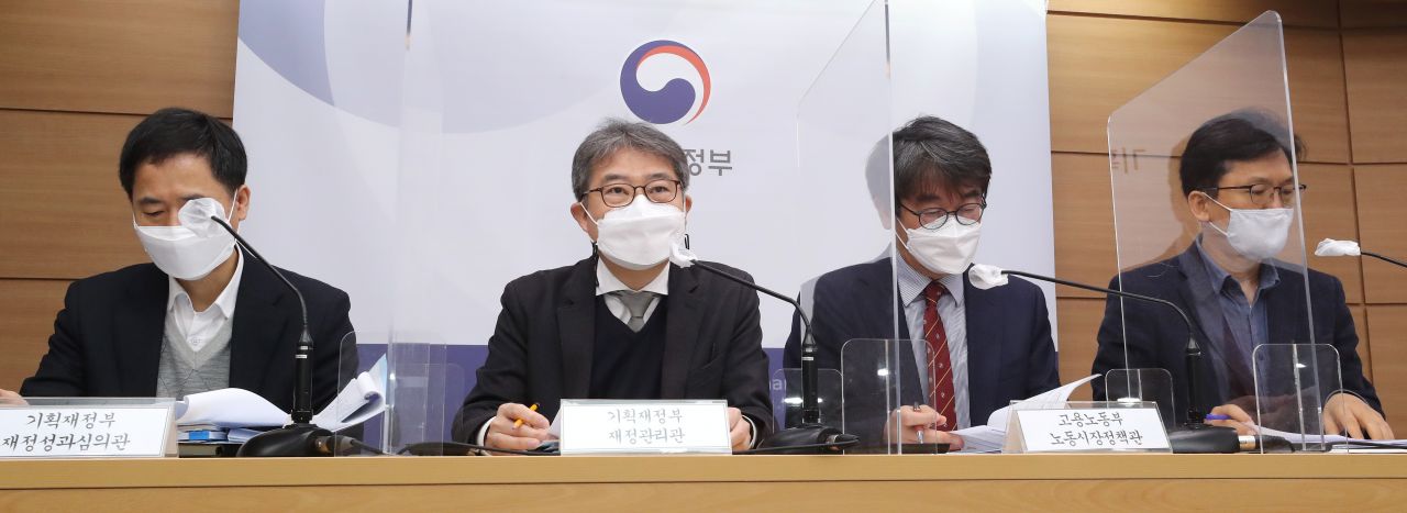 강승준 기획재정부 재정관리관과 관계부처 담당자들이 16일 오전 세종시 정부세종청사에서 3차 재난지원금 집행현황 및 향후 계획과 관련해 브리핑하고 있다. [이미지출처=연합뉴스]