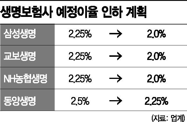 중소 생보사도 인하 행렬에 동참한다. NH농협생명은 다음달 보장성보험의 예정이율을 2.25%에서 2.0%로 조정한다. 종신보험은 지난해 인하돼 이미 2.0%를 적용하고 있다. 동양생명도 1월에 비갱신형 보장성 상품에 대해 2.25%로 내렸고, 다음달 갱신형 보장성 상품과 종신보험도 똑같이 하향한다.