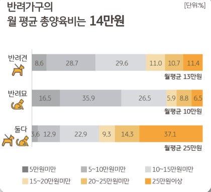 월 평균 14만원 지출…반려견 11만원, 반려묘 7만원 지출반려동물관련 양육비를 반려동물 유형별로 보면, 반려견만 기르는 가구에서는 ‘매월 13만원 정도’ 양육비를 지출하고 있고, 반려묘만 기르는 가구에서는 ‘매월 10만원 정도’를, 반려견과 반려묘 둘다 기르는 가구에서는 ‘매월 25만원 정도’를 지출하고 있다. 반려동물 한마리에 지출되는 양육비를 추산해 보면, 반려견 한마리에 필요한 양육비는 반려견을 기르는 가구가 한마리당 ‘월 11만원 정도’의 양육비를 지출했다. 반면 반려묘만 기르는 가구는 한마리당 ‘월 7만원 정도’의 양육비를 지출하고 있는 것으로 조사됐다.