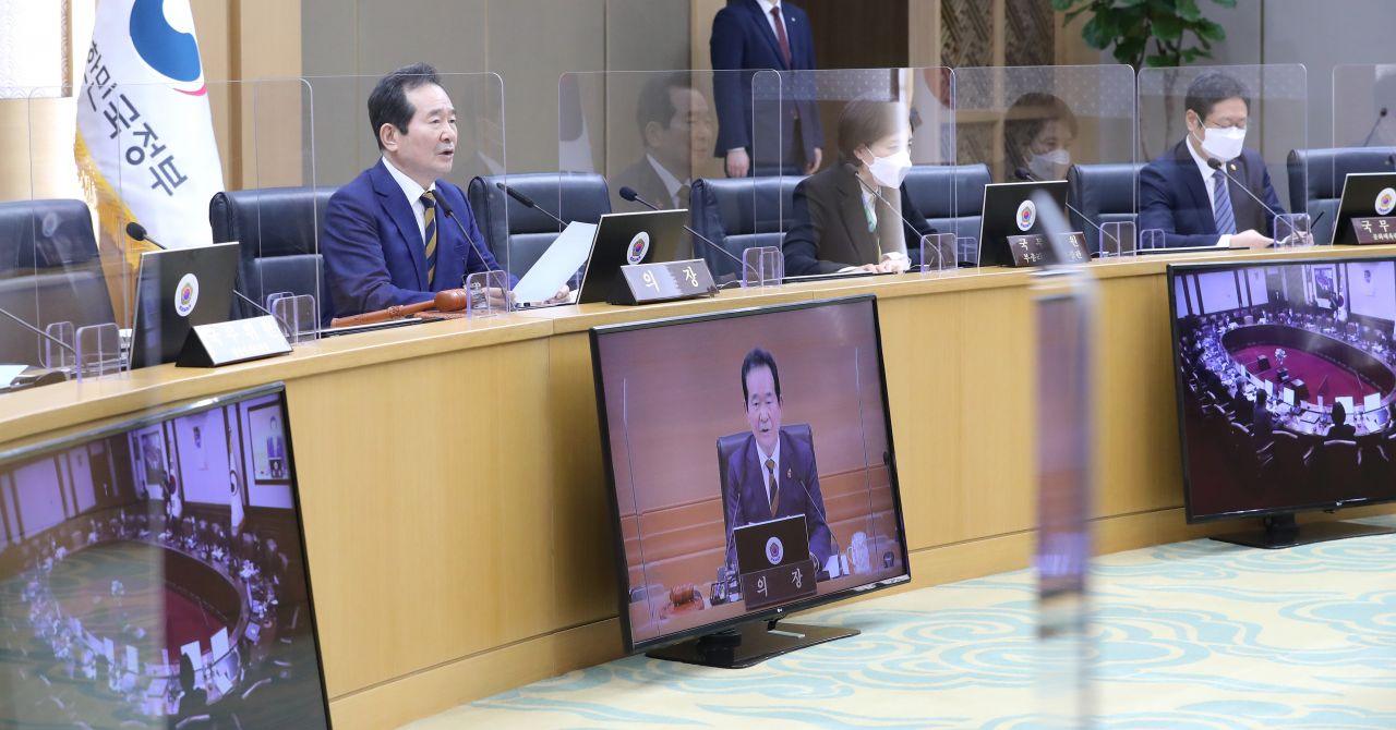 정세균 국무총리(왼쪽)가 23일 오전 세종시 정부세종청사에서 서울과 영상으로 연결해 열린 국무회의를 주재하며 발언하고 있다. 2021.3.23 [이미지출처=연합뉴스]