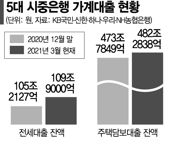 이 기간 5대 은행의 주담대 잔액도 482조2838억원으로 473조7849억원을 기록한 지난해 말보다 8조4989억원(1.8%) 늘었다.