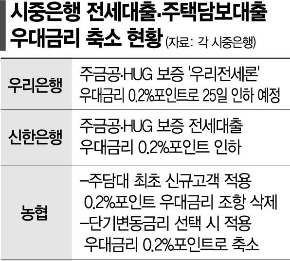 신한은행도 지난 5일부터 주금공·HUG 보증 전세대출의 우대금리를 0.2%포인트 인하했다. 농협은행은 가계 주택담보대출 상품의 최초 신규고객에게 적용하던 연 0.2%의 우대금리 조항을 삭제했다. 또 단기변동금리를 선택했을 때 적용하는 우대금리도 연 0.2%에서 연 0.1%로 축소했다.