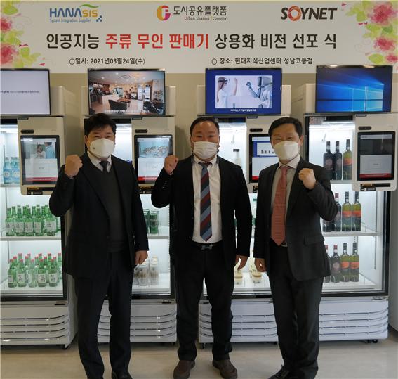 24일 'AI 주류 무인판매기' 상용화 비전 선포식에서 (왼쪽부터) 하나시스 이정용 대표, 도시공유플랫폼 박진석 대표, 소이넷 박정우 대표가 기념사진을 촬영하고 있다.
