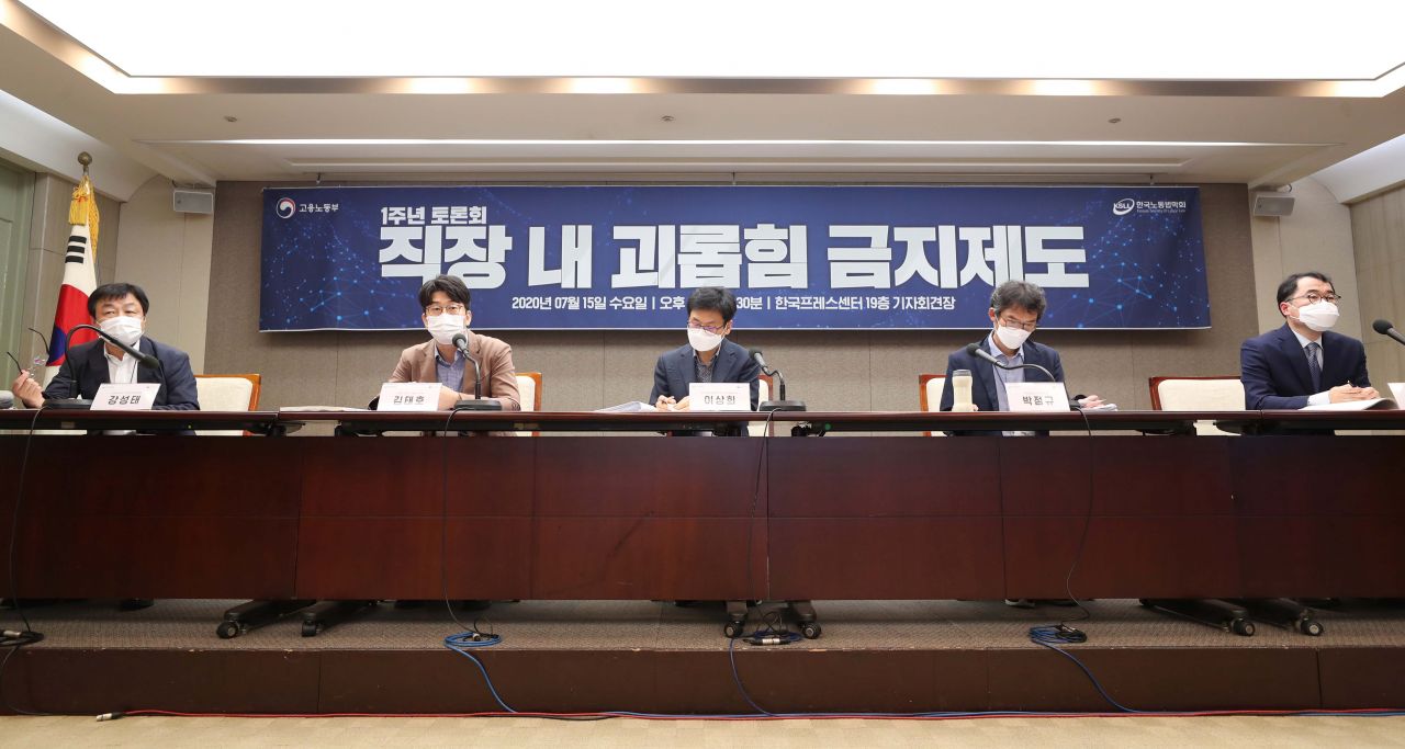 김태호 한국노동연구원 박사가 지난해 7월15일 서울 중구 프레스센터에서 열린 '직장 내 괴롭힘 금지제도 1주년 토론회'에서 직장 내 괴롭힘이 조직행태에 미치는 영향을 주제로 발표하는 모습. /문호남 기자 munonam@