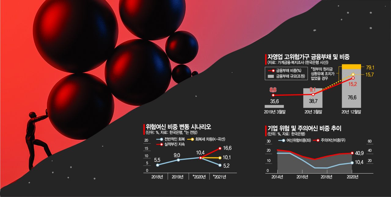대출의 위험 신호는 곳곳에서 감지되고 있다. 부도 가능성이 큰 기업 대출은 전체 기업대출의 10%를 넘어섰고, 빚을 갚을 능력이 취약해 ‘고위험가구’로 분류된 자영업자 가구도 19만2000개에 달하는 것으로 나타났다. 경기가 회복되면서 대출금리가 점차 오를 경우 대출 부실이 현실화될 것이라는 우려가 나온다. 김상봉 한성대 경제학과 교수는 "올해 하반기엔 금리를 올릴 수밖에 없을 것으로 보이는데, 대출이 주식이나 부동산으로 가 있는 데다 금리까지 오르면 대출차주들이 피해를 볼 수밖에 없다"고 말했다. 민좌홍 한은 금융안정국장도 "민간부채가 자산시장으로 유입되며 자산가격은 급등하는 등 금융불균형이 심화했다"면서 "정부지원조치 등이 종료되는 시점에 취약 부문을 중심으로 신용리스크가 현실화될 가능성이 있다"고 밝혔다.