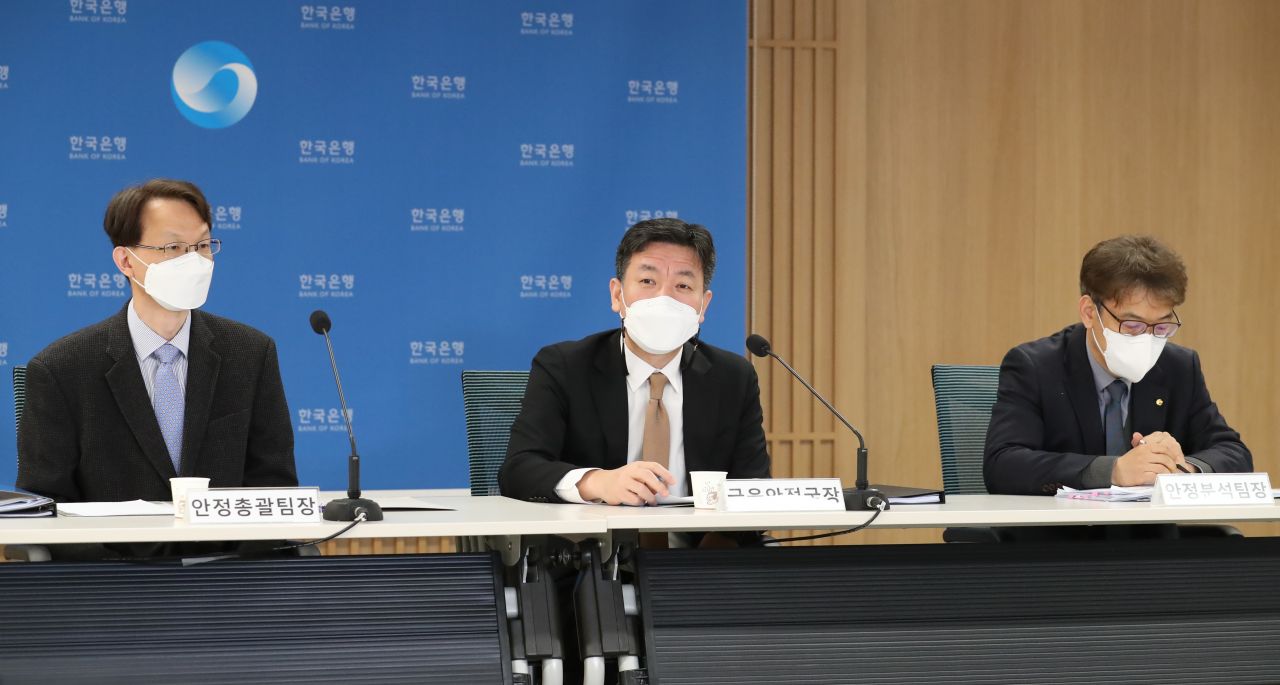 25일 오전 10시 서울 중구 한국은행에서 열린 금융안정상황(2021년 3월) 설명회. 사진 왼쪽부터 이민규 안정총괄팀장, 민좌홍 금융안정국장, 박구도 안정분석팀장