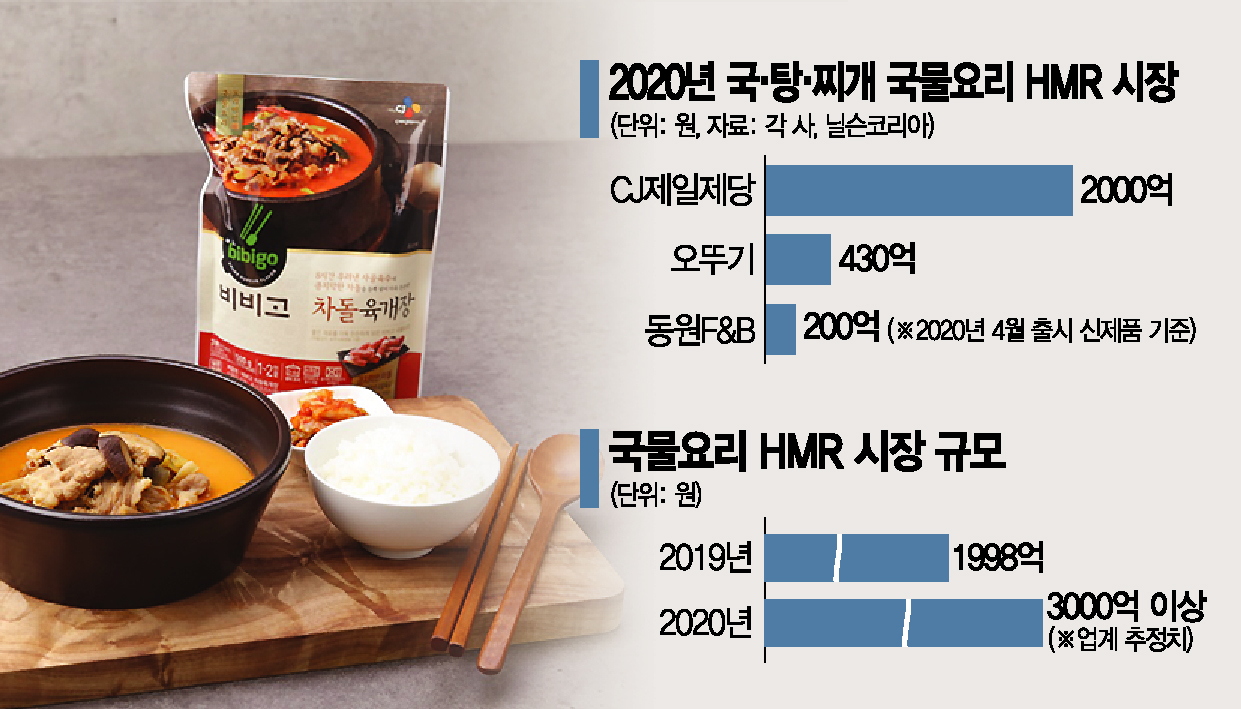 국·찌개 HMR 비비고만 1억 봉지 판매26일 식품업계에 따르면 지난해 HMR 중 국물요리시장은 최소 3000억원대 규모로 성장한 것으로 추정된다. 닐슨코리아가 추정한 2019년도 국물요리 HMR시장 규모인 1998억원보다 1.5배 성장했다.